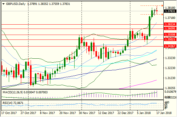 上方阻力位于1.38关口、2016年2月低点1.3835。