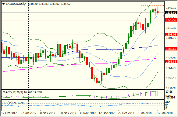 上方阻力位于1340、1350美元、9月高点1357.45美元。