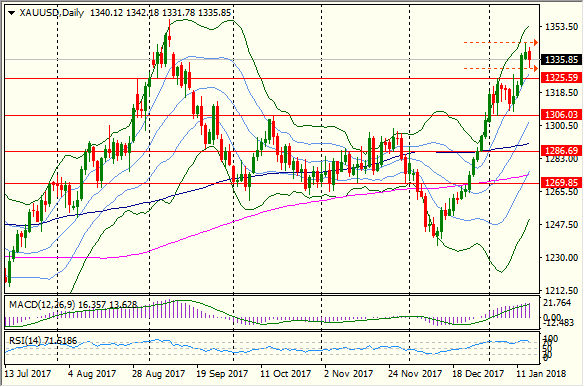 上方阻力位于1340、1350美元、9月高点1357.45美元。