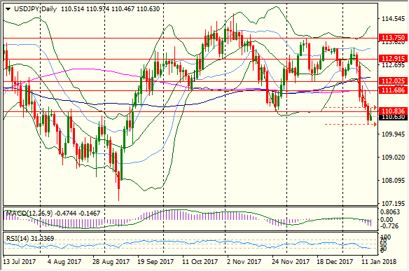 上方阻力位于2017年11月低点110.84、200日均线111.69、112关口;