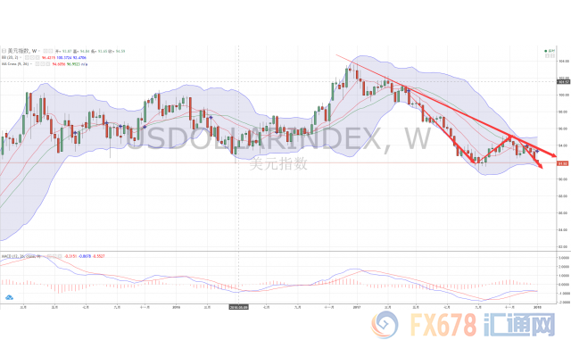 从美元指数的表现来看,中、长期受布林线中轨压制明显,整体下行趋势清晰,93附近形成趋势阻力,后期走势依然偏空。