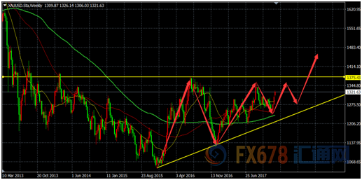 从黄金周线图来看,同样因' 特朗普迎来转折,2016年底黄金创出1122.90低点后迅速反转,测试2016年年中关键压力区1260-1270,而后的回调在120均线处获得支撑,并未触及下方趋势线,周线目前呈三连阳强劲上涨态势,不管从回调幅度,还是上攻动能来看, 黄金的后市都十分值得期待。
