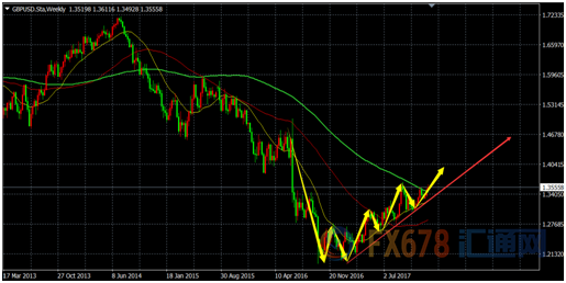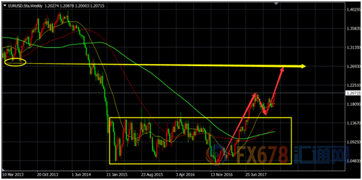 ' 英国脱欧,债务危机,通缩阴影一度使得欧元在2016年中下旬走势低迷,甚至跌破了前两次箱体低点,但2016年底,伴随着美元的持续下挫和自身经济状况的好转,欧元迎来了重要转折。从周线图可以看出,欧元兑美元已经有效突破了底部漫长的箱体整理区间,并于2017年10月底完成了回踩确认,后市可以说一片坦途。2018年一季度,欧元兑美元大概率将实现底部通道倍增,测试2013年低点1.2700一线。