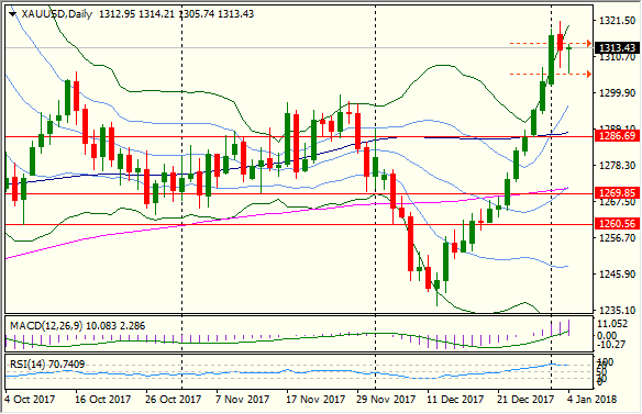 上方阻力位于隔夜高点1321.27美元及1330美元关口。