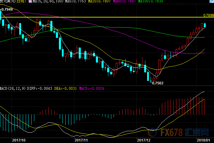尽管今日北京时间7:00澳元创出了新高于0.7869一线,但是与前一日相比总体变化不大。正如这几天所强调的,目前技术指标显示澳元已经进入超买区。但是,强劲的上涨动能暗示了行情有机会到达2017年10月的高点0.7900美元一线,并且这种可能性还在进一步加大。我们对于止损点位做了调整,只有明确跌破了0.7760一线才能预示目前澳元的多头走势已经终结。
