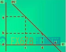 (图中,横轴U值代表失业率,纵轴G值代表通货膨胀率,向右下方倾斜的PC即为菲利普斯曲线。这条曲线表明,当失业率高(d)时通货膨胀率就低(b),当失业率低(c)时通货膨胀率就高(a))