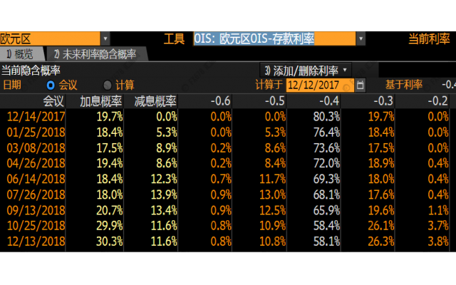 基于隔夜指数掉期(OIS)数据的数学模型显示,本次欧洲央行加息的概率仅为19.6%,2018年12月欧洲央行加息的概率仅为30.3%。 【免责声明】本文仅代表作者本人观点,与汇通网无关。汇通网对文中陈述、观点判断保持中立,不对所包含内容的准确性、可靠性或完整性提供任何明示或暗示的保证,且不构成任何投资建议,请读者仅作参考,并自行承担全部风险与责任。