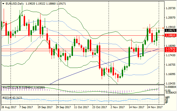 上方阻力位于隔夜高点1.1961、1.20关口以及9月高点1.2092;