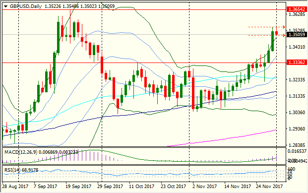 英镑兑美元亚欧时段高位震荡回落,交投于1.3508-1.3539区间;野村指出,如果英国与欧盟的谈判进展继续有良好表现,英镑上月的涨势应该可以延续;谈判任何的进展都将使英国更可能与欧盟达成过渡协议,而这将促使英国央行加速加息。