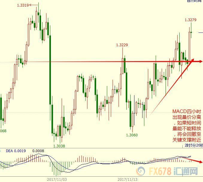 四小时图上,汇价偏向于走高,随着20日均线上穿了200日均线处于当前价位的下方,同时随着技术指标从接近他们中线的位置开始温和的上涨,并且超过了这周的开盘价。价格目前在1.3220到1.3230区间,这是一个短期支撑,更强的支撑在上周的高点1.3259一线。
