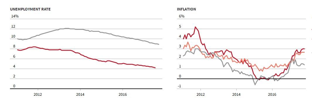 虽然许多发达国家的通胀率依然疲弱,但英国通胀率已从2016年6月脱欧公投时的仅0.5%大幅上升,原因是英镑贬值推高了进口商品价格。