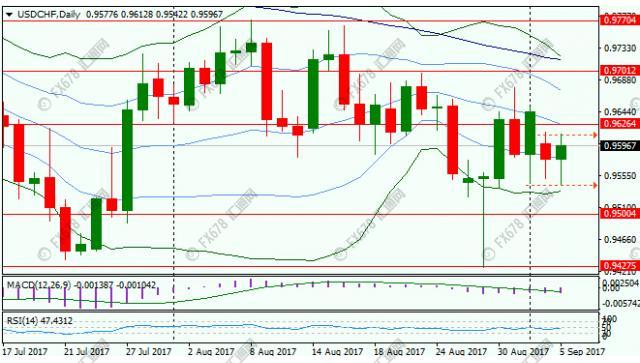 美元兑瑞郎先抑后扬,刷新日高,刷新日高0.9602;虽然有报道称,朝鲜开始移动洲际弹道导弹,为周六前的潜在试射做准备,避险情绪一度打压汇价;但因市场预计欧洲央行本周不会宣布削减QE时间表,欧元时段内走弱,令瑞郎受到拖累,利好汇价。