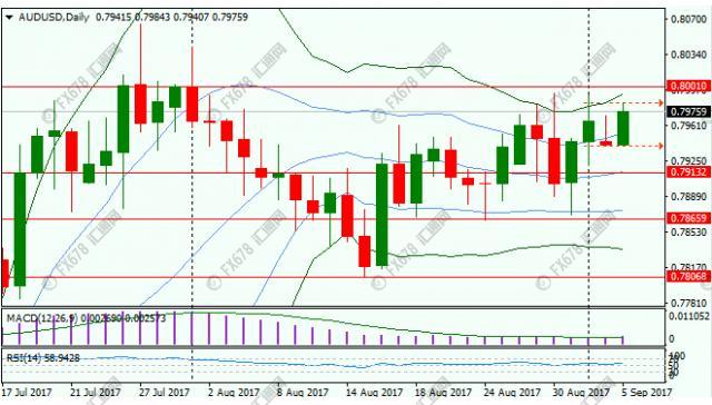 澳元兑美元亚欧时段强劲反弹,刷新两个交易日高点0.7984;中国8月财新服务业PMI数据靓丽提振澳元走强,日内澳洲联储决议维稳,影响有限。周线图上,汇价正测试200周均线阻力,趋势中性偏多;日线图上汇价维持震荡上行格局,中性偏多;上方阻力位于0.80关键心理关口,以及7月下旬高点0.8065;下方支撑位于20日均线0.7913、8月24日低点0.7865,以及8月15日低点0.7807。