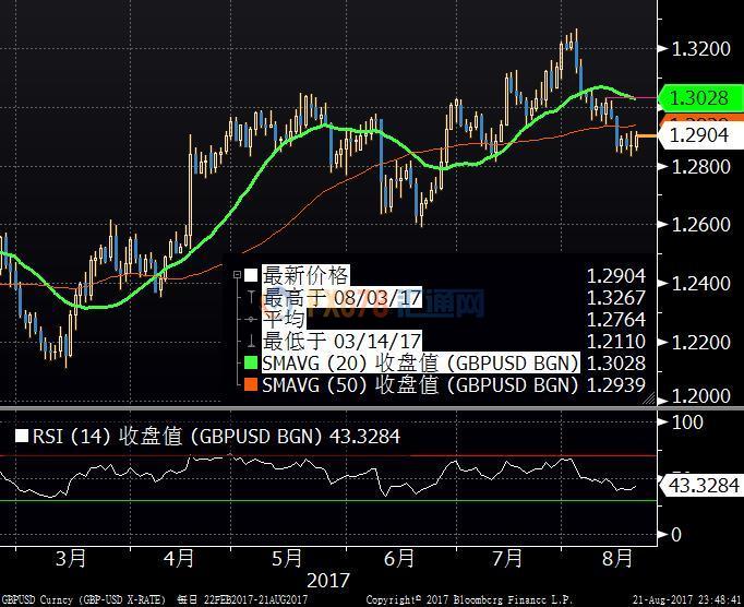 50日均线(橙色线)切入点位1.2939将可能会成为英镑/美元首个阻力位,之后是20日均线(绿色线)切入位1.3028和8月11日高点1.3033所在阻力水平。