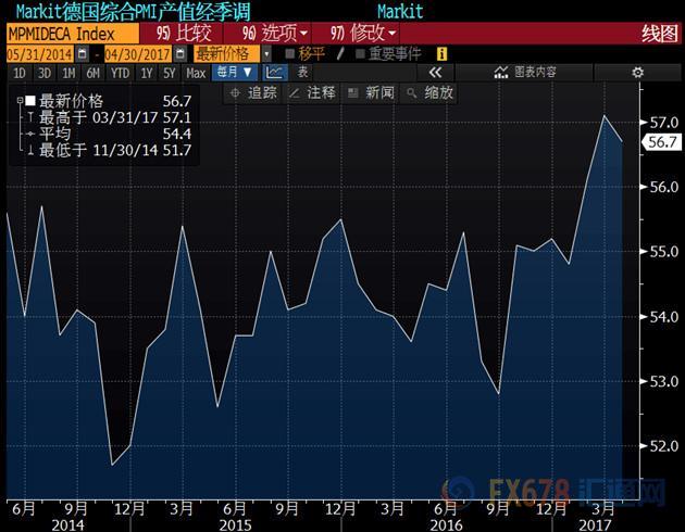 汇通网援引的彭博数据显示,德国5月Markit综合PMI升至57.3,创下2011年4月以来最高水平,高于预期值56.6和4月终值56.7;该数据追踪制造业及服务业活动,占整体经济规模超过三分之二。