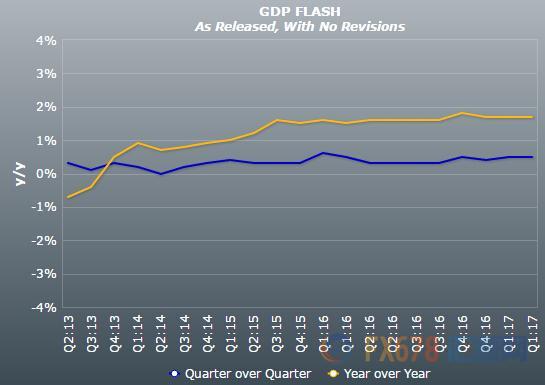 期间公布的欧元区一季度季调后GDP数据表现符合预期和前值,欧元区一季度季调后GDP季率初值实际录得0.50%,年率初值实际录得1.70%,双双符合预期值和前值。