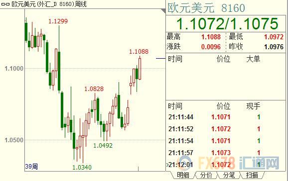 截止发稿,汇价交投于1.1088,日内暴涨近1%,日线连续第三个交易日走出一根大阳线,不到两周时间内再度刷新去年11月10日以来高点至1.1088。