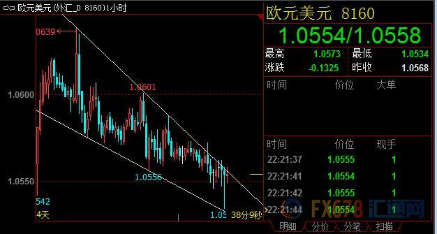 截止发稿,欧元兑美元交投于1.0541,下跌0.25%。技术上看,汇价1小时图已经完成下降楔形构筑,短期来看,后市震荡回升概率较大。