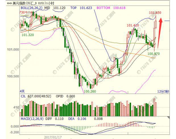 纽市盘初公布的美国上周初请失业金人数、12月新屋开工、费城联储制造业指数均表现靓丽,美元指数急升60点,收复日内跌幅,触及三个交易日高点101.65。