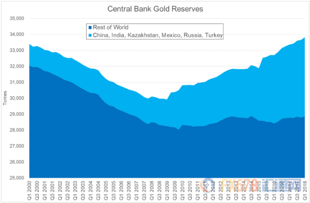 截至2008年,全球央行黄金储备下降,这主要是受发达国家央行抛售所推动。但是自2008年以后很少有国家进行出售,同时大部分的购买主要还是集中于几个国家。