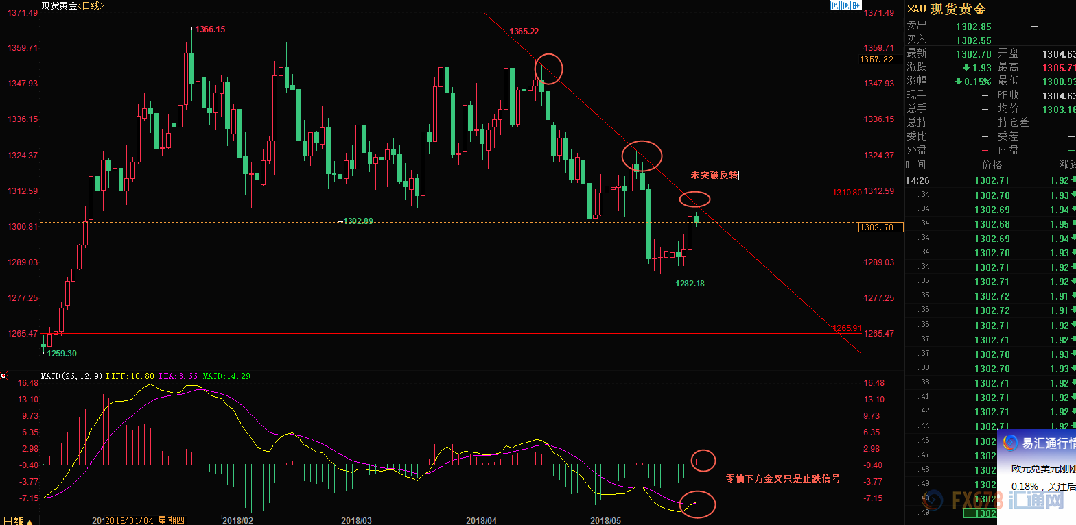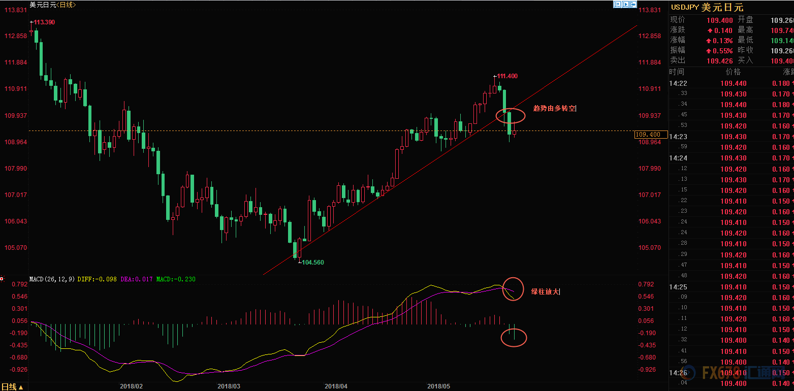技术上看,日元的走强的态势相较于黄金更为显著。美元兑日元以大阴线形势跌破上升趋势线,MACD也出现绿柱且逐渐放大,此为空方强烈信号,日元相对于美元单边走强的行情就此开启。