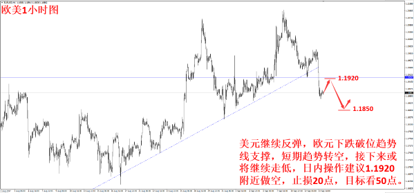 ' 美元继续反弹,' 欧元下跌破位趋势线支撑,短期趋势转空,接下来或将继续走低,日内操作建议1.1920附近做空,止损20点,目标看50点。