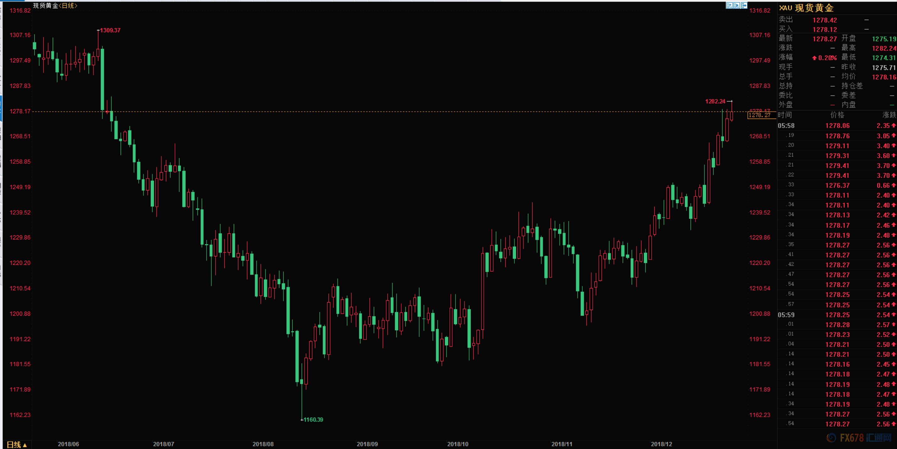 汇通网讯——本周现货黄金一度突破1280整数关口,最高升至1282.34美元、盎司,创6月19日以来高点。因一系列风险因素可能导致经济增速放缓、加剧股市的抛售潮,随着金融市场恐慌情绪加剧,投资者纷纷涌向黄金以求避险。另外美国边境墙问题悬而未决,且有消息称特朗普有意解雇美联储主席鲍威尔,这进一步降低了美元的吸引力,推动黄金走强。