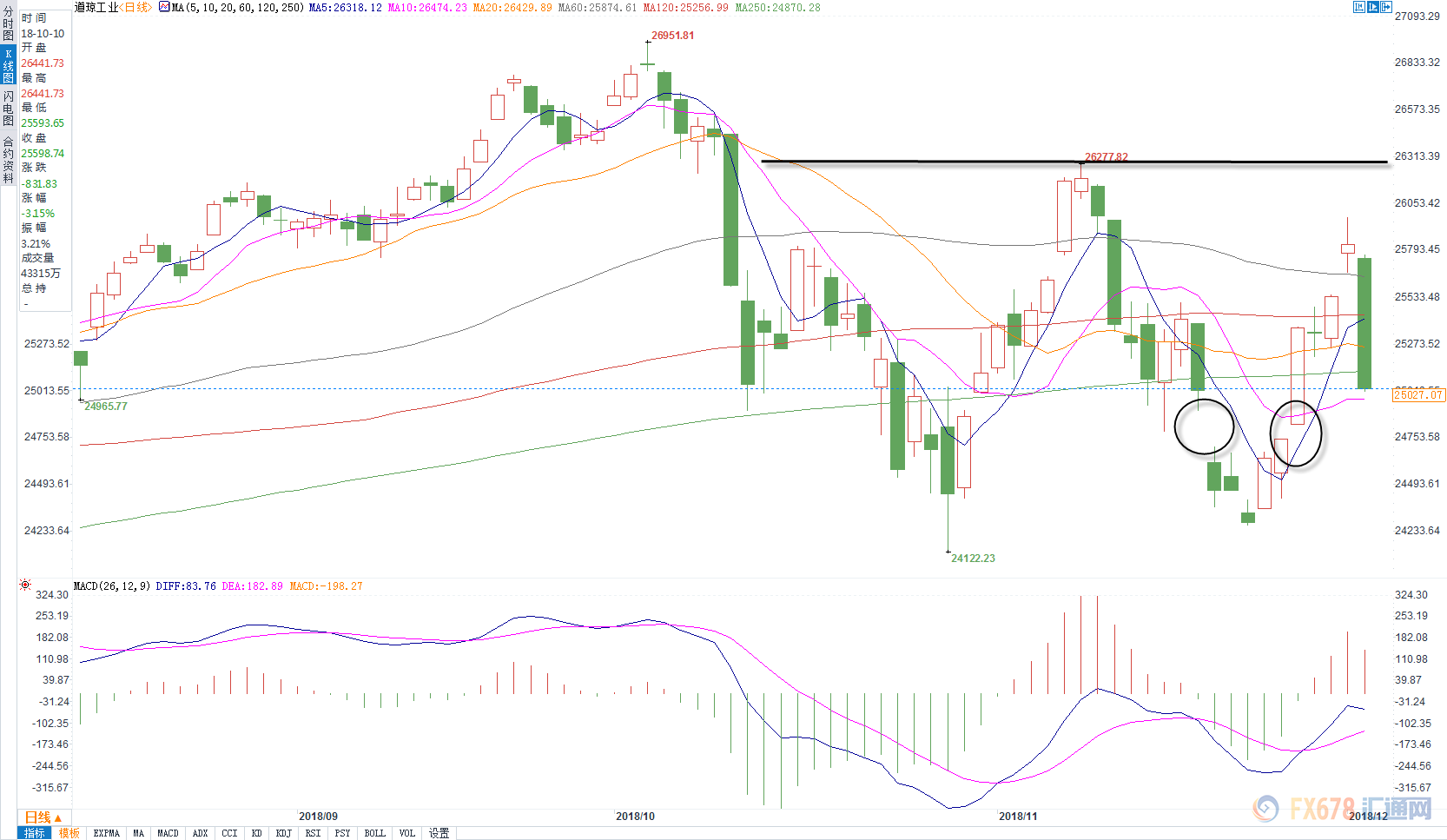 nload=imgresize(this); >从道琼斯日图级别来看,上方有明显的颈线位压制,一旦突破就形成W底,行情将继续向上。昨日的长黑表明了上方的压力巨大,想要突破难度较大,这说明美股想要重新走牛没有那么简单。从均线来看,均线系统无序排列,表明行情相对纠结,没有趋势可言。从K线来看,G20缺口直接越过60天线,必定会再次回落到60天线下方。但是,昨天的回落直接回补多方缺口,表明缺口无效,后市将继续延续前期走势的基调。狮子金融认为,在上周,K线有形成岛型反转向上,只要不回补这个缺口,行情还有继续震荡向上的机会,一旦回补,行情就还有创新低的机会。