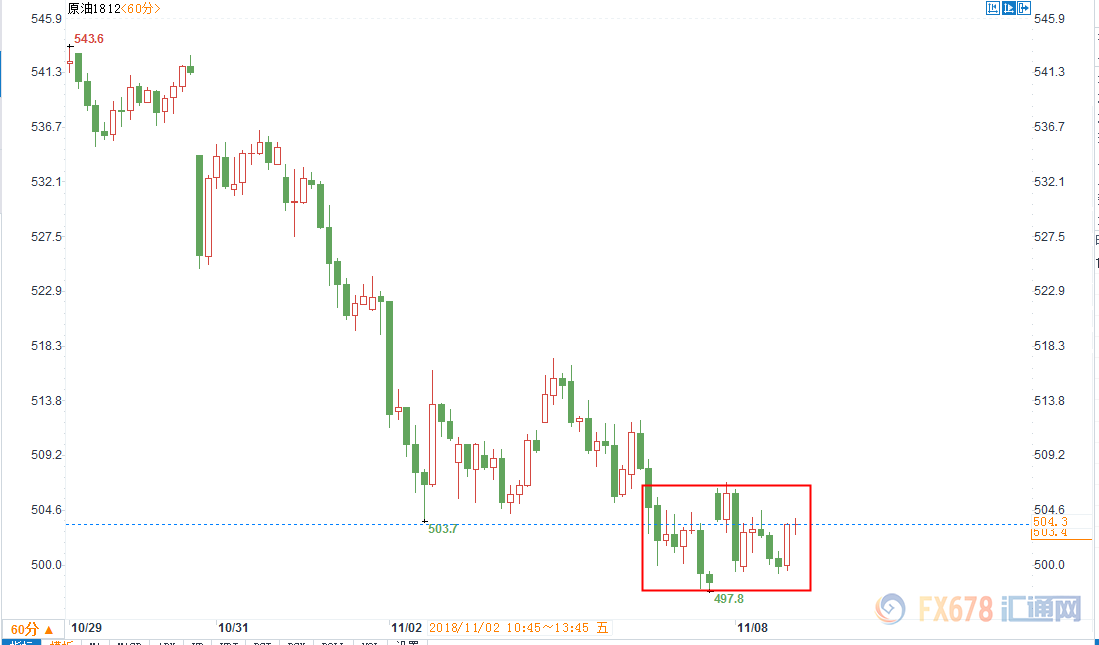 对照INE原油日内走势看,目前刚好处于一个箱体之内,上方最直接的压力是505元,下方最直接的支撑是498.7元。