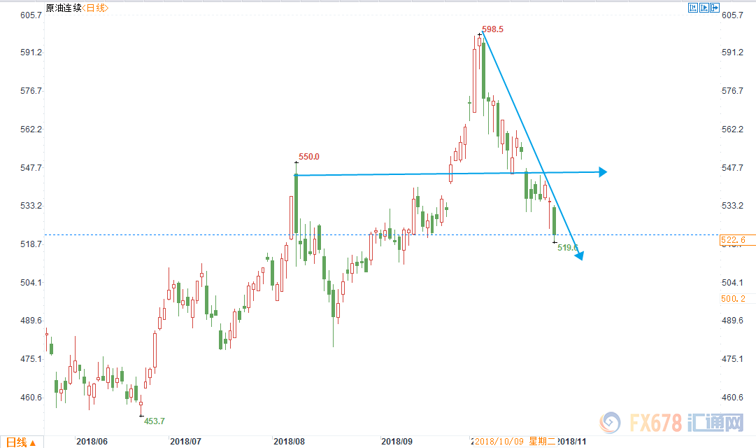 周四(11月1日)中国INE' 原油延续了近期的跌势,并一度失守520元/桶关口。这是因为近期市场看空油市的情绪明显升温,同时' 美国、沙特以及' 俄罗斯原油产量续创新高加剧了市场对于供给过剩的担忧。