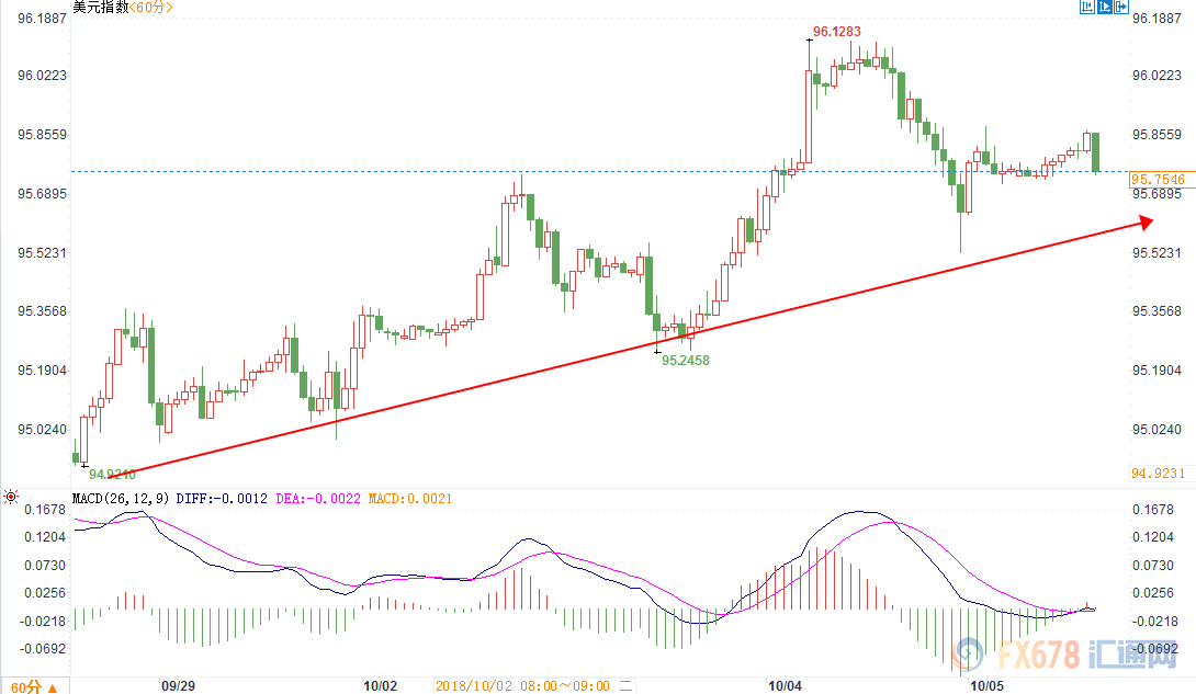 周五(10月5日)受美债收益率回落的影响,' 美元出现了一波快速回落,目前美元维持在95.8附近做窄幅震荡。