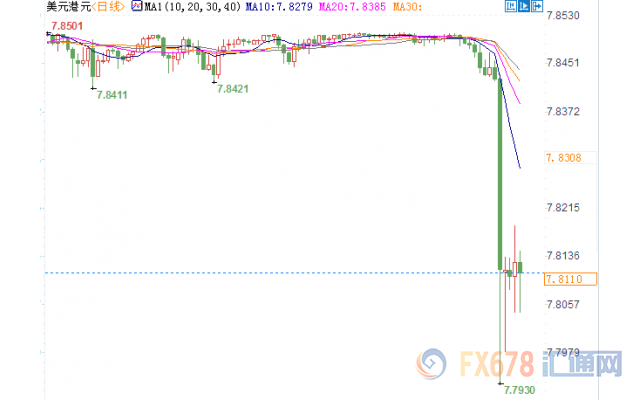 此外,因香港金管局宣布,上调贴现窗基本利率25个基点,至2.50%,港元兑美元汇率快速走高,短线拉升70点。