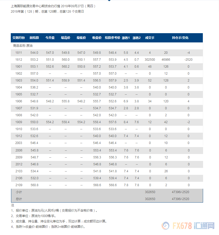上海原油价格上涨。主力合约SC1812,以557.7元/桶收盘,上涨4.5元,涨幅为0.81%。全部合约成交302650手,持仓量减少2520手至47396手。主力合约成交302500手,持仓量减少2520手至46866手。