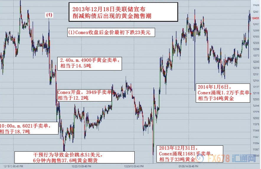 除此之外,他们还举了发生在Globex系统中的另一个例子。2013年12月18日,美联储FOMC宣布每月削减购债100亿美元的决定后,Globex系统随即出现了数笔卖出纽交所' 黄金期货的大规模交易。