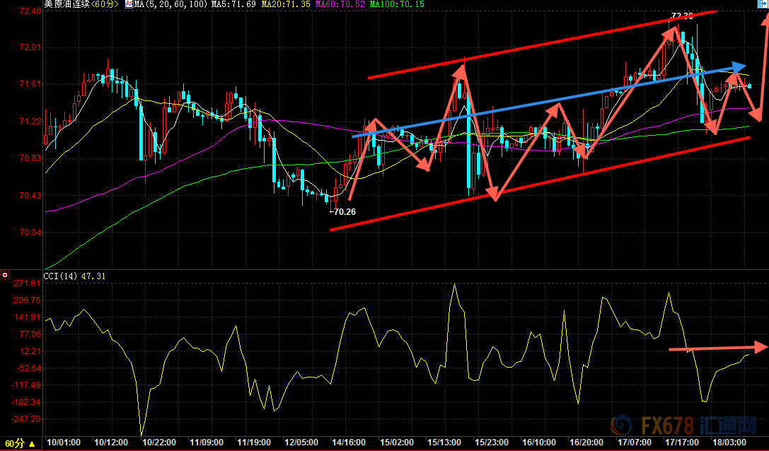 目前油价处于上升通道内,只要没有跌破71.15美元,油价将会续创新高,上方最直接的压力是72美元和72.3美元,这个位置上方是72.45美元。