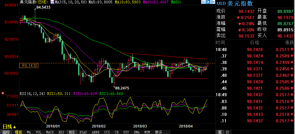 在周二(4月17日)于89.22构筑短期底部后,美元指数连续第四个交易日上涨,目前已向上突破90关键整数关口,汇价的温和反弹伴随着美债收益率的上涨,其中两年期和五年期国债均涨至多年高位,分别位于2.43%上方和2.75%附近。
