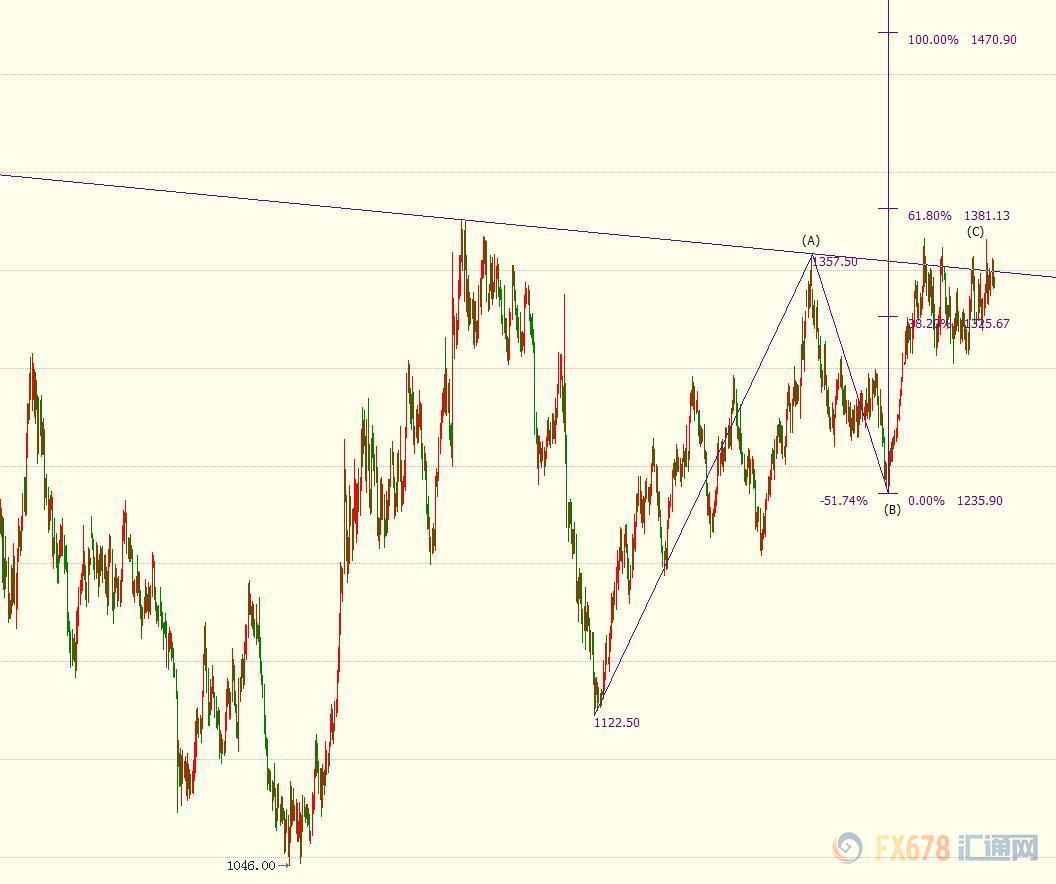 现货黄金上攻每盎司1354美元阻力未果,可能在该水位下方盘旋,抑或跌向1326美元支撑。上述阻力及支撑位分别为上升(C)浪的50%及38.2%预测位。