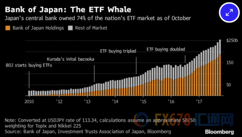 汇通网讯——GoldTelegraph网站分析师德鲁斯撰文表示,截至2017年,日本央行持有日本四分之三的交易所交易基金(EFT),成为日经225指数的最大股东。尽管美联储开始逆转其货币宽松政策,其它央行,比如欧洲央行、日本央行和瑞士国家银行,在量化宽松策略上变得更加激进,继续肆无忌惮地印钞。