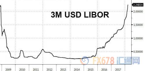 nload=imgresize(this); >金融媒体近一个月来也一直在说,今年对风险资产最重要的因素是LIBOR飙升以及伦敦银行同业拆息与隔夜指数掉期的利差(LIBOR-OIS)“爆棚”,这将对从短期融资成本到浮动利率债的边际成本产生影响。下图为' 美元3个月LIBOR:
