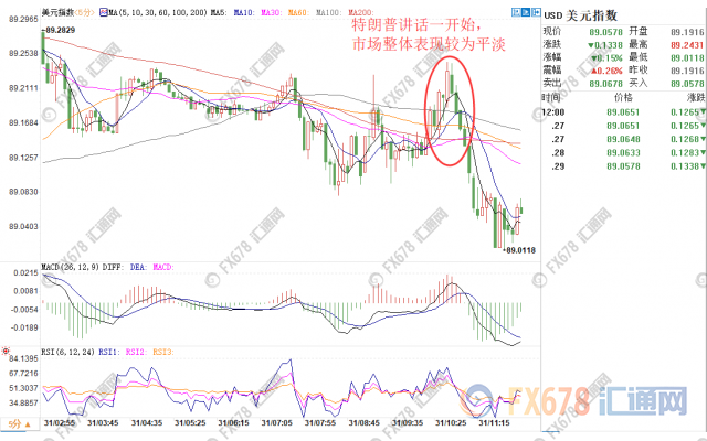 在特朗普提到上述主要话题时,美元指数微幅受到提振,美元指数自89.13涨至89.20一线,整体来看反应仍较平淡。