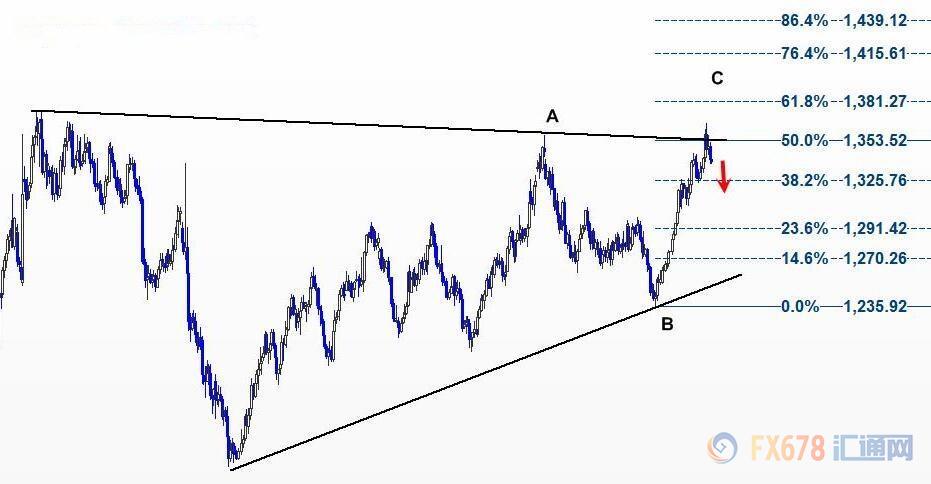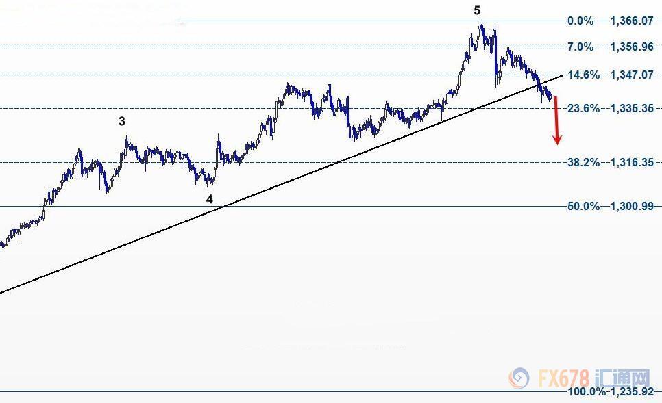 波浪形态和费波纳奇回档位分析显示,现货黄金或跌破每盎司1335美元的支撑位,并进一步跌向下道支撑位1316美元。