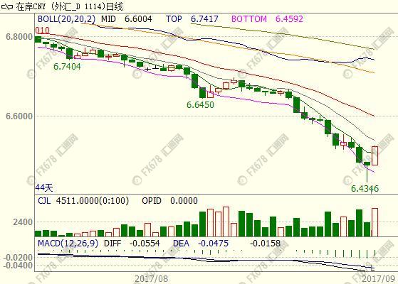 在过去两周的十个交易日中,在岸人民币有9个交易日收涨,上周在岸人民币一度升破6.44关口,最大升幅逾1.8%,收盘上涨1.19%。