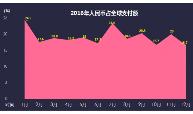 SWIFT提供的报告显示,2016年12月,人民币支付总额与11月相比下降15.08%,同期全球所有货币支付额增加了0.67%。