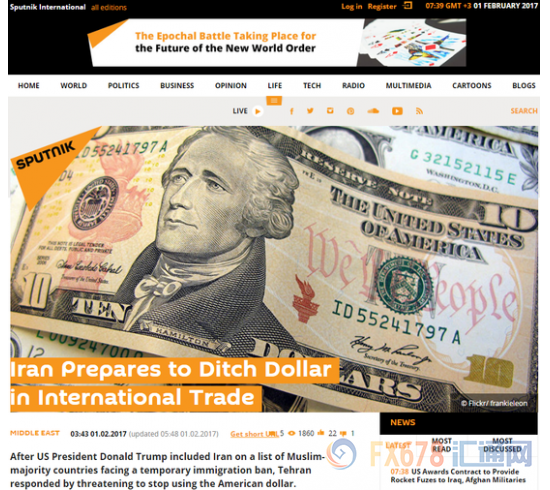 据俄媒2月1日报道,针对' 特朗普将伊朗列入穆斯林国家名单并禁止其居民入境' 美国,伊朗又出一反制措施——弃用' 美元