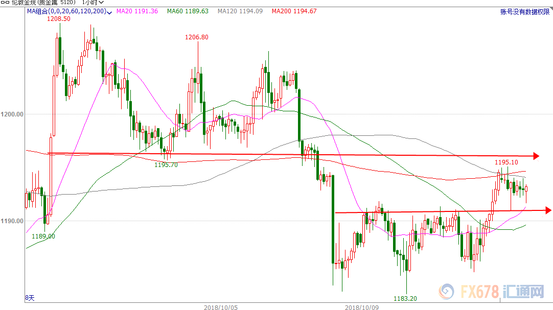 亚盘时段,现货黄金现报1193.44美元,跌幅0.09%。10月11日亚洲时段,现货黄金开盘后回吐昨日部分涨幅,一度下挫3美金,日内跌幅达0.21%后企稳回升。昨晚美股遭遇黑色星期三,道指收跌800点,标普跌超3%,均创2月以来最大单日跌幅。受此影响,VIX恐慌指数飙升至20以上,处于近半年来高位,黄金在避险买盘的推动下逆势走强,并一度收至1195美元附近。