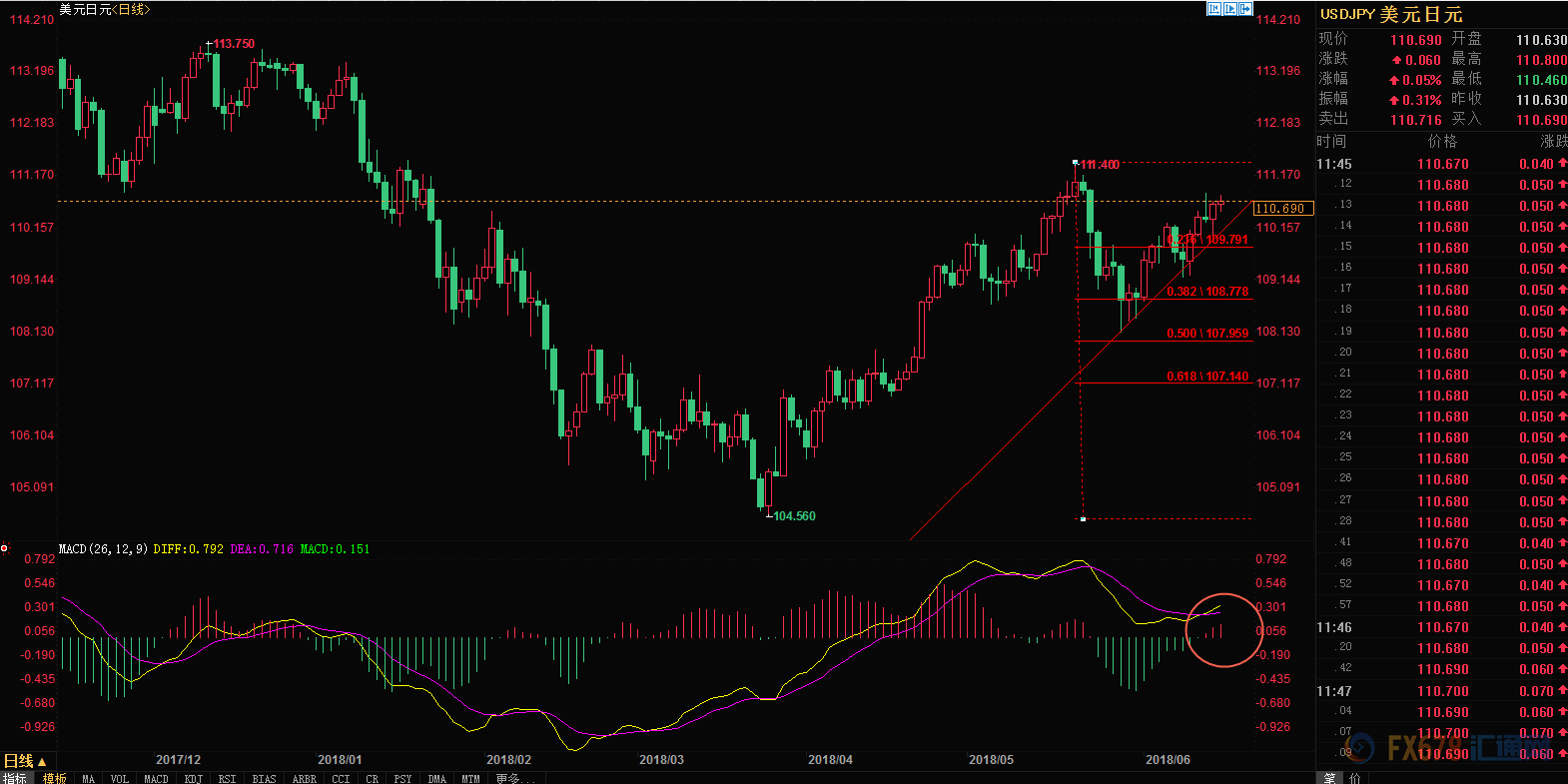 技术上看,在触碰0.382的调整位置附近后,美元兑日元开启了新一波上涨,目前MACD金叉,红柱放大,续创新高可能只是时间问题。