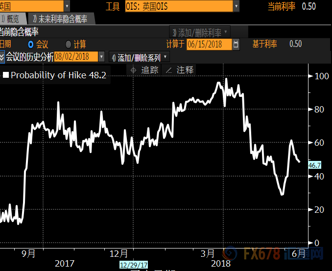 但美指的不断上扬还是给英镑造成很大压力,另外下周四(6月21日)又' 英国6月利率决议,货币政策会议纪要。根据利率' 期货定价显示,英国央行6月基本不可能加息,同时8月加息概率一直在下降。