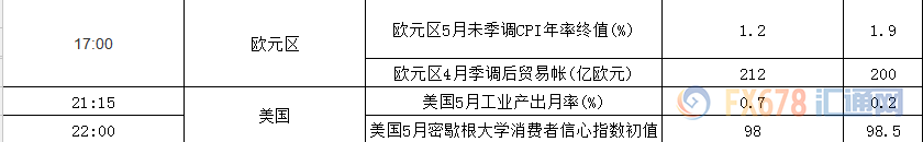 展望日内,欧洲时段,' 欧元区5月未季调CPI年率终值以及4月贸易帐数据值得关注。纽盘时段还将迎来' 美国5月工业产出月率,6月密歇根大学消费者信心指数初值。