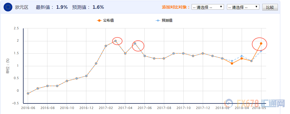 投资者需要注意的是即将公布的' 欧元区5月CPI数据,预计将从1.2%飙升至1.9%,如果真的能实现则意味着通胀已率先回升至2017年4月高点水平。