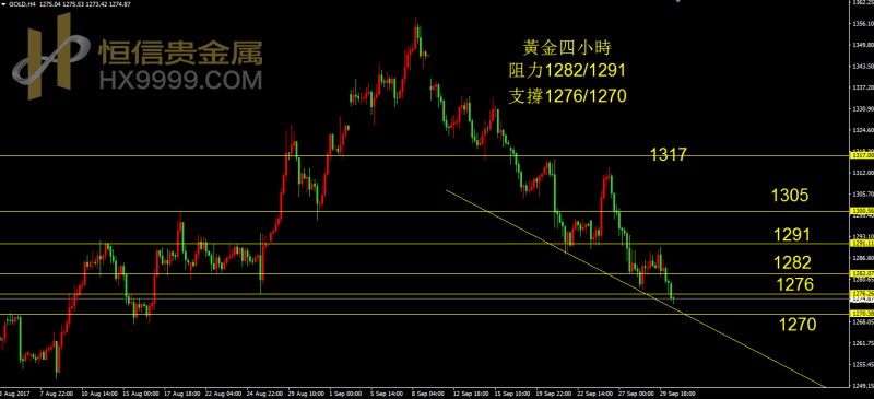 国际现货黄金周五(9月29日)开盘于1287.28' 美元/盎司,最高上涨至1290.45美元/盎司,最低下跌至1276.78美元/盎司,最终收盘于1279.87美元/盎司,下跌7.36美元,跌幅0.57%。基本面 :